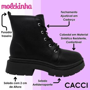 O solado, com dois centímetros de altura, traz estabilidade e firmeza, enquanto a base antiderrapante garante segurança em cada movimento. Ideal para explorar o mundo com confiança e estilo, o coturno Molekinha é aquele item indispensável para compor looks autênticos e cheios de personalidade.