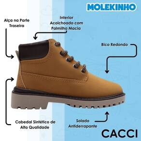 Bota Coturno Infantil Menino Molekinho é confeccionado com material sintético (napa). Seu cabedal é todo em tecido liso sem muitos detalhes e apetrechos, dando maior estabilidade e sofisticação. Possui fechamento em cadarço para praticidade. Seu forro é têxtil para melhor conforto e transpiração. Palmilha grossa fabricada em PU, proporcionando conforto e maciez durante o caminhar. Seu solado é de PVC antiderrapante, garantindo maior aderência aos mais variados tipos de solos.