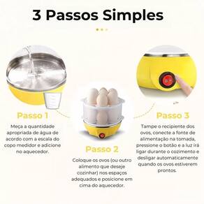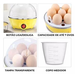 Cozedor de ovos elétrico a vapor com capacidade para até 7 ovos. Permite o preparo de ovos cozidos, omeletes, ovos pochê, ovos de codorna e legumes. Possui luz indicadora de funcionamento que apaga automaticamente ao final do cozimento. Tempo de cozimento variável de 3 a 10 minutos. Fácil de limpar e compacto.Base antiderrapante