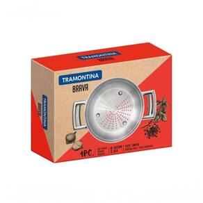 Cozi-vapore Brava Tramontina 20cm Em Aço Inox Perfeita para quem aprecia a misturade traços modernos com a elegância do clássico aço inox. Esta é a proposta dalinha Brava, com panelas ideais para aquelas comidinhas tradicionais do dia adia. Recomendações de Uso: Antes do uso: remova as eventuais etiquetas e lave-o com água quente, detergente e esponja macia. Outros tipos de produto como palha de aço, poderão riscar ou prejudicar o acabamento da peç de uso: as alças de inox aquecem durante o cozimento. Aconselhamos o uso de luvas durante o manuseio. Alguns alimentos que possuem amido, como massa e arroz, poderão deixar manchas na parte interna do cozi-vapore durante o cozimento. Deixe o cozi-vapore quente somente em superfícies resistentes ao ós o uso: para remover facilmente as manchas, passe um pano umedecido com suco de limão ou vinagre. Evite deixar alimento no cozi-vapore por muito tempo o sal também pode provocar manchas. Para que o cozi-vapore de aço inox fique sempre bonito e com brilho, recomendamos que seja lavado somente com detergente e esponja. Depois da lavagem, sempre que possível, enxágue o cozi-vapore com água quente e seque-o imediatamente, para que ele mantenha o brilho , pois o cloro e as substâncias contidas na água podem deixar manchas no cozi-vapore. Não guarde a peça em locais úmidos. A umidade também provoca manchas. Para manter o brilho, a Tramontina desenvolveu uma pasta especial para polir e remover manchas nos produtos de aço inox, que está disponível nos principais pontos de venda (94537000).- Foto meramente ilustrativa. Informações Adicionais:
