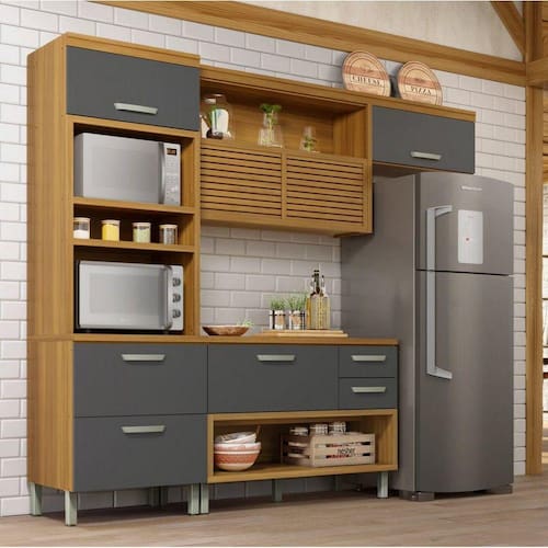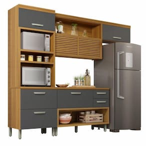Diferenciais únicos: Modernas portas com abertura basculante e pistão a gás. Modernos puxadores de ABS beleza, qualidade e durabilidade. Corrediça Telescópica Abertura Integral: Robusta e com três estágios, esta corrediça é ideal para o uso diário, facilitando o acesso aos utensílios. Ergonômicos gavetões com laterais e traseiros altos para armazenagem com segurança de utensílios e mantimentos. Paneleiro com nicho para micro-ondas e forno elétrico