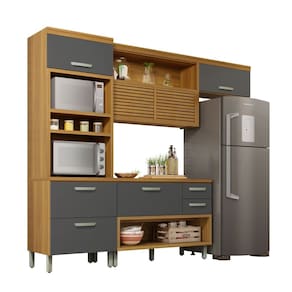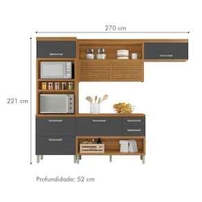 Estilo: Moderno Modular: Sim Peso (kg): 156.5 Garantia: 03 Meses Altura (cm): 221 Descrição: A Cozinha 3 Peças Torre Quente Ripado Princesa traz estilo e funcionalidade para o seu ambiente. Composta por um painel torre quente e armários aéreos com acabamento ripado, oferece praticidade e beleza. Esse conjunto é ideal para quem busca um design moderno, que além de decorar, organiza a cozinha com elegância. Fabricada em 100% MDF, essa cozinha é resistente, fácil de limpar e ideal para armazenar utensílios, alimentos e até eletrodomésticos de pequeno porte, mantendo tudo ao seu alcance. Esse modelo suporta micro-ondas e outros eletrodomésticos? Sim, a torre quente foi projetada para suportar micro-ondas ou forno elétrico com segurança. O acabamento ripado facilita a manutenção? Sim, o MDF ripado é de fácil limpeza, bastando um pano úmido para mantê-lo como novo. Acabamento: Impressão Largura (cm): 270 Possui Pés: 09 Possui Vidro: Não Possui Portas: Sim Tipo de Porta: Misto (Bater e Basculante) Altura dos Pés: 16 Pés Reguláveis: Sim Possui Gavetas: Sim Possui Rodízio: Não Acompanha Tampo: Sim Profundidade (cm): 52 Escala de Brilho: Fosco Gaveta com Chave: Não Material dos Pés: Polipropileno Material da Porta: MDF Material do Fundo: Chapa de Fibra Material do Tampo: MDF Origem do Produto: Nacional Acabamento dos Pés: Pintura Ambiente Principal: Cozinha Balcão Suporta Pia: Não Espessura do Tampo (mm): 15 Material da Gaveta: MDF Material Principal: MDF Necessita Montagem: Sim Possui Prateleiras: Sim Acabamento da Porta: Impressão Quantidade de Peças: 3 Sapatas Niveladoras: Sim Acabamento da Gaveta: Impressão Balcão Acompanha Pia: Não Material da Corrediça: Metálica Material da Prateleira: MDF Peso Máximo por Gaveta: 5 Acabamento da Prateleira: Impressão Complexidade da Montagem: Alta: deve ser montado por um montador especializado Tipo de Puxador da Porta: Externo Escala de Brilho da Porta: Fosco Tipo de Puxador da Gaveta: Externo Escala de Brilho da Gaveta: Fosco Peso Máximo por Prateleira: 15 Tipo de Armário de Cozinha: Cozinha Compacta Possui Recorte para Cooktop: Não Tipo de Corrediça da Gaveta: Metálica Telescópica Material do Puxador da Porta: ABS Material do Puxador da Gaveta: ABS Escala de Brilho da Prateleira: Fosco Medida de Cada Item (A x L x P) (novo): 1 Paneleiro: 221cm x 64cm x 45cm 1 Aereo 200cm: 76,4cm x 200cm x 32cm 1 Balcão 120cm: 86cm x 120cm x 52cm Material da Dobradiça/Corrediça da Porta: Aço Recomendações de Uso, Manutenção e Limpeza: Utilizar pano macio levemente umedecido e na sequencia pano macio seco. Marca: Nesher Móveis Cor do Produto: Freijó/Grafite Itens Inclusos: 1 Cozinha Completa, 1 Kit Ferragens e 1 Manual de Montagem. Linha ou Coleção: Torre Quente Ripado Sistema de Montagem: Parafusos, cavilhas e Minifix.