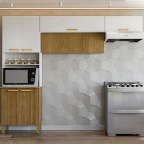 Cozinha 3 Peças, design moderno que se adapta ao seu espaço! Produzida em MDP (12/15mm) com acabamento em pintura UV. Conta com 09 portas, sendo 02 basculantes e 03 com sistema de abertura passante (sem puxadores), suporte a gás, dobradiças metálicas, nicho para microondas/forno, prateleiras internas e passa fio embutido. Os puxadores ergonômicos e pés reguláveis são em plástico resistente. Este produto será entregue em 03 volumes.