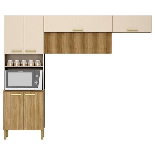 Cozinha 3 Peças, design moderno que se adapta ao seu espaço! Produzida em MDP (12/15mm) com acabamento em pintura UV. Conta com 09 portas, sendo 02 basculantes e 03 com sistema de abertura passante (sem puxadores), suporte a gás, dobradiças metálicas, nicho para microondas/forno, prateleiras internas e passa fio embutido. Os puxadores ergonômicos e pés reguláveis são em plástico resistente. Este produto será entregue em 03 volumes.