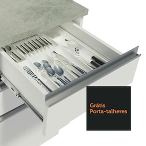 Fabricada com itens de alta qualidade, possui puxadores em alumínio, gavetas com corrediças telescópicas, portas com dobradiças com amortecimento e pistão a gás para a porta basculante.
