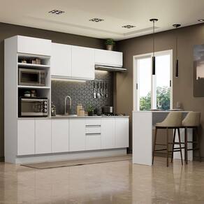 É desenvolvido com materiais de alta qualidade, como puxadores com alça de alumínio e dobradiças metálicas com amortecimento. O balcão acompanha tampo em pintura Rustic, que pode ser recortado para colocação de cooktop. Além disso, conta com pés reguláveis em PVC e rodapé removível em MDP.