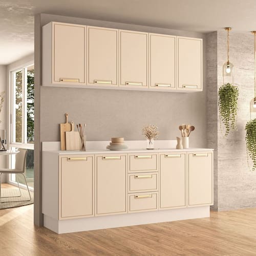 Modular : Sim Peso (kg) : 110.92 Garantia : 06 Meses Altura (cm) : 224.5 Acabamento : Pintura UV Largura (cm) : 200 Possui Pés : Rodapé Possui Vidro : Não Possui Portas : Sim Tipo de Porta : Misto (Bater e Basculante) Altura dos Pés : 15 Pés Reguláveis : Sim Possui Gavetas : Sim Possui Rodízio : Não Suporta Até (kg) : 30 Acompanha Tampo : Sim Profundidade (cm) : 52 Escala de Brilho : Semi-Fosco Gaveta com Chave : Não Material dos Pés : Plástico Serviço Montagem : 114259443 Material da Porta : MDF/MDP Material do Tampo : MDF/MDP Origem do Produto : Nacional Acabamento dos Pés : Pintura Ambiente Principal : Cozinha Balcão Suporta Pia : Sim Material da Gaveta : MDF/MDP Material Principal : MDF/MDP Possui Prateleiras : Sim Acabamento da Porta : Finish Foil Quantidade de Peças : 4 Sapatas Niveladoras : Sim Acabamento da Gaveta : Finish Foil Balcão Acompanha Pia : Não Quantidade de Portas : 4 Portas Material da Prateleira : MDF/MDP Peso Máximo por Gaveta : 5 Acabamento da Prateleira : Finish Foil Tipo de Puxador da Porta : Externo Escala de Brilho da Porta : Semi-Fosco Tipo de Puxador da Gaveta : Externo Escala de Brilho da Gaveta : Semi-Fosco Peso Máximo por Prateleira : 3 Tipo de Armário de Cozinha : Cozinha Compacta Possui Recorte para Cooktop : Não Tipo de Corrediça da Gaveta : Metálica Telescópica Material do Puxador da Porta : Alumínio Material do Puxador da Gaveta : Alumínio Escala de Brilho da Prateleira : Semi-Fosco Medida de Cada Item (A x L x P) (novo) : Balcão: 120x81x50,5; Aéreo 120x60x30,5; Balcão 83x92,5x52; Aéreo 80x66x30,5 Material da Dobradiça/Corrediça da Porta : Alumínio Marca : Politorno Cor Interna : Branco Cor : Branco/Creme Cor do Produto : Branco/Creme Itens Inclusos : 1 Cozinha Desmontada + Kit de Ferragens + Manual de Montagem + Termo de Garantia Cor Predominante : Bege Linha ou Coleção : Amara Quantidade de Prateleiras : 04 Prateleiras Quantidade de Gavetas : 03 Gavetas Quantidade do Produto : 4
