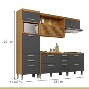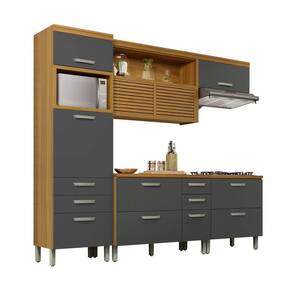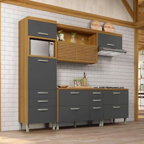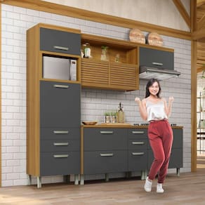 A cozinha completa 4 peças Princesa Nesher 100% MDF tem design contemporâneo e é muito prática. Inspirada em cozinhas planejadas, está disponível em módulos, permitindo composições variadas, projetos exclusivos, conforme o espaço e o gosto do consumidor. O armário aéreo de 200cm, foi projeto com uma porta articulada ripada, que traz aconchego, grande beleza e harmonia ao conjunto. Este mesmo armário possui montagem Flex, podendo o armário de geladeira/depurador ser posicionado a direita ou à esquerda na 1ª montagem para guarda os utensílios mais utilizados no dia a dia, facilitando acesso e manutenção. Acabamento da Prateleira: Impressão Escala de Brilho da Prateleira: Semi-Brilho Acabamento da Gaveta: Impressão Escala de Brilho da Gaveta: Semi-Brilho Material do Puxador da Gaveta: ABS Acabamento da Porta: Impressão Escala de Brilho da Porta: Semi-Brilho Material do Puxador da Porta: ABS Acabamento dos Pés: Pintura Acompanha Tampo: Sim Altura dos Pés: 16 cm Ambiente Principal: Cozinha Complexidade da Montagem: Média: pode ser montado por mais de uma pessoa e/ou necessite de maior conhecimento para montagem Cor: Freijó/Grafite Cor do Produto: Freijó/Grafite Escala de Brilho: Fosco Espessura do Material da Estrutura: 15 mm Gaveta com Chave: Não Informações Complementares: Modernas portas com abertura basculante e pistão a gás, sem uma ripada. - Dobradiças grandes caneco 35 mm para portas basculantes e SlowMotion com freio anti-impacto para a porta de bater . - Modernos puxadores de ABS na cor gold, beleza, qualidade e dura Itens Inclusos: 1 Paneleiro, 2 Balcões e 1 Armário Aéreo e Manual de Montagem. Linha ou Coleção: Princesa - Nesher Manual de Montagem e Instalação: https://product-hub-prd.madeiramadeira.com.br/900878/documents/dfe7e79f-1335-4ff2-852d-8cc421b6536abalcaofechadocombalcaode80.pdf Material da Dobradiça/Corrediça da Porta: Metálica Material da Gaveta: MDF Material da Porta: MDF Material da Prateleira: MDF Material do Fundo: Chapa de Fibra Material do Tampo: MDF Material dos Pés: Polipropileno Medida de cada item (A x L x P): Aéreo: 76,4cm x 200cm x 32cm; Balcão 1 Gaveta 1 Porta: 86cm x 80cm x 52cm; Balcão 1 Porta, 2 Gavetas: 86cm x 120cm x 52cm; Paneleiro : 221cm x 64cm x 52cm Montagem Flex: Não Necessita Montagem: Sim O Balcão Acompanha Pia: Não Origem do Produto: Nacional Pés Reguláveis: Sim Peso: 192 kg Peso Máximo por Gaveta: 5 kg Peso Máximo por Prateleira: 15 kg Possui Pés: 13 Possui Portas: Sim Possui Prateleiras: Sim Possui recorte para Cooktop: Não Possui Rodízio: Não Recomendações de Uso, Manutenção e Limpeza: Utilizar pano macio levemente umedecido e na sequencia pano macio seco. Sapatas Niveladoras: Sim Sistema de Montagem: Parafusos, cavilhas e minifix Suporta Até (kg): 130 kg Tamanho Indicado da Pia: 120 x 53cm Tipo de Corrediça da Gaveta: Metálica Telescópica Tipo de Dobradiça da Porta: 35 mm Tipo de Puxador da Gaveta: Externo Tipo de Puxador da Porta: Externo