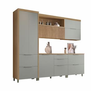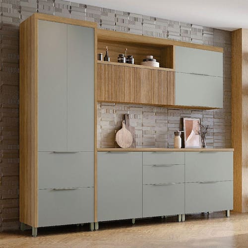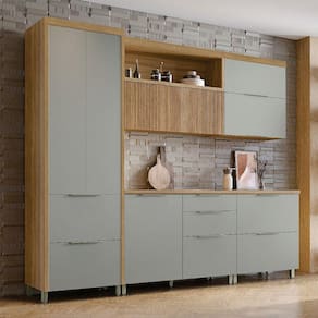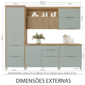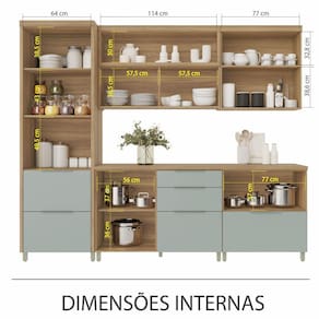 Diferenciais únicos: Modernas portas com abertura basculante e pistão a gás, sendo uma de 120cm canelada, tendência, sofisticação e beleza. Dobradiças com freio anti-impacto slow motion, porta de 60 cm com 3 dobradiças, conforto e garantia de durabilidade. Modernos puxadores de alumínio, tendência, sofisticação, durabilidade e beleza. Corrediça Telescópica Abertura Integral: Robusta e com três estágios, esta corrediça é ideal para o uso diário, facilitando o acesso aos utensílios. Ergonômico gavetão com laterais e traseiro altos para armazenagem com segurança de utensílios e mantimentos. Gaveta porta condimentos e Gaveta com organizador de talheres, conforto e praticidade no uso diário.