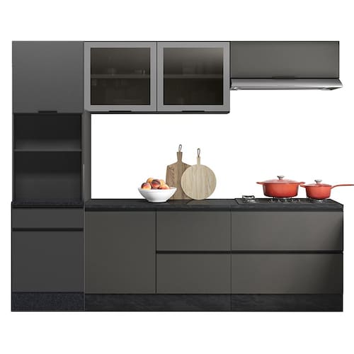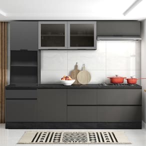 Cozinha Modulada 5 Peças sendo Balcão com Tampo, conta com excelente qualidade e acabamento de alto padrão, projetada para oferecer funcionalidade e elegância para sua cozinha, possui estrutura em MDP 15mm e tampo de 27mm de espessura, pintura UV acetinada. Composta por 7 portas sendo 2 das portas em vidro fume com dobradiças metálicas de 35 mm e função slow motion, proporcionando um fechamento suave e silencioso, e 2 porta basculante equipada com pistão a gás, conta também com 4 gavetas, sendo uma com porta-talheres incluso. Todas são equipadas com corrediças telescópicas, permitindo abertura total e acesso facilitado aos utensílios. Paneleiro com espaço para dispor micro-ondas (A.40cm x L.55cm x P.50cm), nicho decorativo (A.28,5cm x L.55cm x P.29,5cm), balcão de 80cm que pode ser adaptado para cooktops de 4 ou 5 bocas, prateleiras internas com amplo espaço para armazenamento, puxadores em polímero com acabamento de alta qualidade conferem um toque moderno ao design dos móveis. Os pés em PVC de 14,5cm são reguláveis, garantindo o nivelamento perfeito dos moveis. Além disso, os rodapés possuem presilhas modelo click na espessura de 15 mm, facilitando sua remoção quando necessário. Este conjunto é ideal para quem busca aliar estética e praticidade, transformando a cozinha em um espaço agradável e eficiente. Este móvel chegará em sua casa separado em 8 volumes.