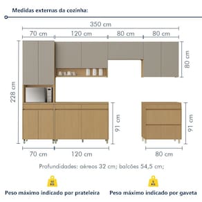 O design ripado exige manutenção? Não, o design ripado é de fácil manutenção e durável. Acabamento da Prateleira: Impressão Escala de Brilho da Prateleira: Semi-Brilho Acabamento da Gaveta: Impressão Escala de Brilho da Gaveta: Semi-Brilho Acabamento da Porta: Impressão Escala de Brilho da Porta: Semi-Brilho Acabamento dos Pés: Pintura Acompanha Tampo: Sim Altura dos Pés: 10 cm Altura Máxima dos Pés: 10.0000 Ambiente Principal: Cozinha Balcão Suporta Pia: Não codigo_ean: 7900288288677 Complexidade da Montagem: Alta: deve ser montado por um montador especializado Cor: Carvalho Cor do Produto: Carvalho Escala de Brilho: Semi-Brilho Gaveta com Chave: Não Itens Inclusos: 1 Cozinha Completa, Kit Ferragens e Manual de Montagem Linha ou Coleção: Simone Mendes Manual de Montagem e Instalação: https://product-hub-prd.madeiramadeira.com.br/416293977/documents/37d5c994-d569-41cf-8730-d506c6df8bb6333078373217640049326788.pdf Marca: Nesher Móveis Material da Corrediça: Metálica Material da Dobradiça/Corrediça da Porta: Metálica Material da Gaveta: MDF Material da Porta: MDF Material da Prateleira: MDF Material do Tampo: MDF Material dos Pés: ABS Medida de cada item (A x L x P): Aéreo 2 : 80cmx80cmx32; Aéreo Nicho: 80cmx120cmx32; Aéreo 1 Porta: 40cmx80cmx32; Balcão 80: 91cmx80cmx54,5; Balcão 120: 91cmx120cmx54,5; Paneleiro: 228cmx70cmx54,5 modular: Sim Necessita Montagem: Sim O Balcão Acompanha Pia: Não Origem do Produto: Nacional Pés Reguláveis: Sim Peso: 239,52 kg Peso Máximo por Gaveta: 5 kg Peso Máximo por Prateleira: 10 kg Possui Pés: 13 Possui Portas: Sim Possui Prateleiras: Sim Possui recorte para Cooktop: Não Possui Rodízio: Não Produto Montado: Sim Recomendações de Uso, Manutenção e Limpeza: Utilizar pano macio levemente umedecido e na sequencia pano macio seco. Sapatas Niveladoras: Sim Sistema de Montagem: Parafusos e Cavilhas Tipo de Corrediça da Gaveta: Metálica Telescópica Tipo de Dobradiça da Porta: 35 mm Tipo de Puxador da Gaveta: Embutido Tipo de Puxador da Porta: Embutido Marca: Não Informado