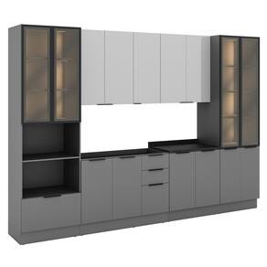 A cozinha Lumina combina estética sofisticada e praticidade em um projeto completo e versátil. Com 2,40 m de altura, conta com acabamento em lacca, rodapé em PVC e um visual elegante, valorizado pelo contraste entre o cinza intenso da estrutura e o cinza claro das portas. Composta por seis módulos, oferece excelente aproveitamento do espaço e flexibilidade para diferentes layouts de cozinha. A qualidade dos materiais se destaca nos detalhes, como dobradiças de 35 mm com amortecimento, corrediças telescópicas com extração total e puxadores slim em alumínio preto, que reforçam o estilo moderno do conjunto.