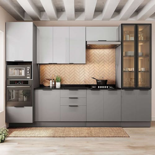 A cozinha Lumina combina estética contemporânea e funcionalidade em um conjunto elegante e versátil. Com 2,40 m de altura, possui acabamento em lacca, rodapé em PVC e um design sofisticado, valorizado pelo contraste entre o cinza intenso da estrutura e o cinza claro das portas. Composta por seis módulos, a Lumina oferece excelente organização interna e flexibilidade de composição, adaptando-se facilmente a diferentes projetos de cozinha. Seus compartimentos bem distribuídos garantem praticidade no uso diário e melhor aproveitamento do espaço. Os acabamentos reforçam a qualidade do conjunto, com dobradiças de 35 mm com amortecimento, corrediças telescópicas com extração total e puxadores slim em alumínio preto, que destacam o visual moderno.
