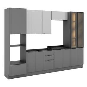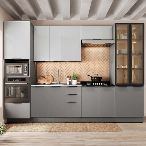 A cozinha Lumina combina design contemporâneo, funcionalidade e sofisticação em um conjunto versátil que se adapta a diferentes projetos de cozinha. Com 2,40 m de altura, rodapé em PVC e um visual elegante, destacado pelo contraste entre o cinza intenso da estrutura e o cinza claro das portas. Composta por seis módulos, oferece excelente aproveitamento interno e organização inteligente, com compartimentos bem distribuídos que facilitam a rotina. Os materiais e acabamentos reforçam a qualidade do conjunto, com dobradiças de 35 mm com amortecimento, corrediças telescópicas com extração total e puxadores slim em alumínio preto, que valorizam o estilo moderno. O balcão possui 97 cm de altura, garantindo conforto e ergonomia no uso diário.