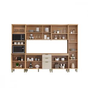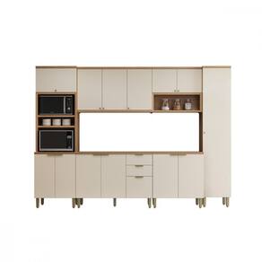 Material: MDF Portas: 14 portas, sendo 13 de abrir e 1 basculantes Prateleiras: 10 em MDF Dobradicas: 30 metalicas Puxador: 16 puxadores, sendo 7 de plastico e 9 de aluminio Pes: 17 Pes de plasticos com altura de 16,5cm Nicho : 2 nicho Gavetas: 2 gavetas Tampo: 25mm de espessura