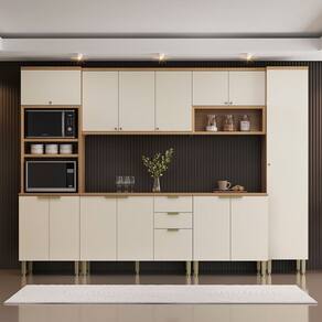 A Cozinha Selene, composta por 6 modulos, e a escolha ideal para quem busca aliar modernidade e funcionalidade no ambiente. Fabricada 100 em MDF, garante resistencia e um acabamento de alto padrao. Possui dobradicas com amortecimento e elegantes puxadores dourados de sobrepor, que conferem sofisticacao ao design. O conjunto inclui uma torre com nichos, armario aereo de 0,8m com nicho emoldurado, e um paneleiro, oferecendo mais praticidade e espaco para organizacao. Perfeita para transformar sua cozinha em um espaco bonito, funcional e bem estruturado.