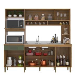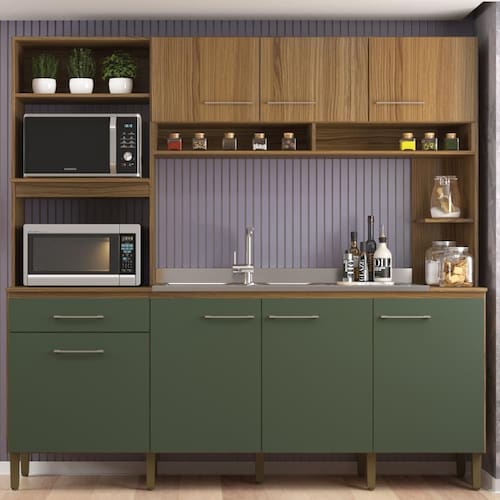 Cozinha compacta e completa da Decibal Móveis! Tem tudo o que você precisa! Com espaço para dois fornos, tem 7 portas de bater e uma gaveta. Os puxadores tem cor levemente dourada e os nichos e prateleiras dão a organização que você precisa. Uma cozinha linda, funcional e com excelente qualidade única. Um produto resistente que tem tudo o que você precisa.