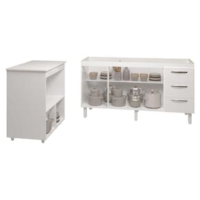 Cozinha Balcão Armário Gabinete De Pia 150 Cm Deise E Balcão Amanda Para Forno Elétrico E Microondas Branco Confira o Kit Balcão Gabinete para Pia Deise 150 cm + Balcão Multiuso Amanda, a solução perfeita para quem busca organização, praticidade e elegância na cozinha. O Balcão Deise oferece amplo espaço com 3 portas e 3 gavetas, ideal para armazenar seus utensílios com facilidade. Produzido em MDP, ele conta com pés reguláveis e puxadores cromados, trazendo um toque moderno ao ambiente. Já o Balcão Amanda é um multiuso versátil, com espaço dedicado para forno elétrico e a possibilidade de usar o micro-ondas no tampo. Além disso, possui 2 portas frontais para guardar seus itens do dia a dia de forma prática e organizada. Características do Balcão de Pia Deise 148 cm: Altura: 83,5 cm (com pés) | 69 cm (sem pés) Largura: 148 cm (ideal para pia de 150 cm) Profundidade: 50 cm Material: MDP (madeira) Portas: 3 Gavetas: 3 Prateleiras: 1 Puxadores: 6 plásticos cromados Pés: 6 reguláveis de plástico (altura: 16,5 cm, ajustáveis até 18 cm) Corrediças: Metálicas Tampo incluído: Não Indicação de uso: Cozinha