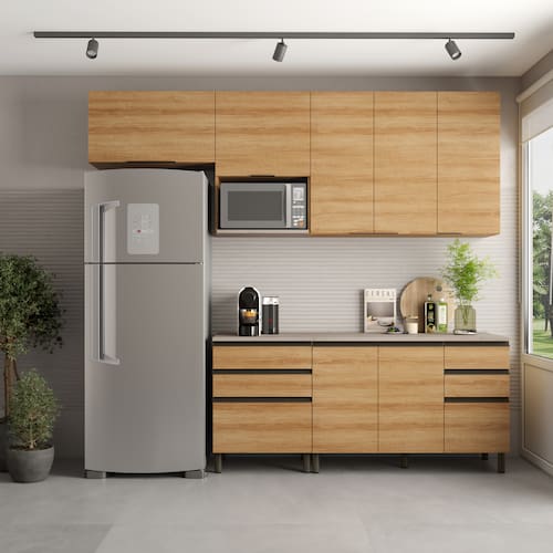 Cozinha Bartira Cristal com 7 Portas, 6 Gavetas, 4 Prateleiras e Nicho para Micro-ondas - 260cm de Largura - Lâmina Mel