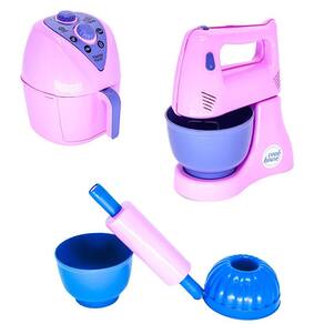 O Kit vem com Geladeira, Microondas, Comidinhas, Air Fryer, Batedeira, Forminhas com Rolo, Panelinhas com acessório sortido