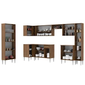 - Ela é dividida em oito módulos independentes: paneleiro duplo; balcão de canto reto; armário aéreo de canto reto com duas portas e adega; balcão de pia; armário aéreo com duas portas e dois nichos; balcão com duas portas; armário aéreo com duas portas; paneleiro simples.