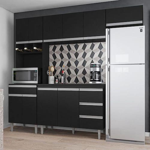 Sua cozinha ideal está aqui, pensando em você que não tem muito espaço e procura por cozinha compacta apresentamos essa linda opção, a Cozinha da linha Andréia desenvolvida com todo carinho pela AJL com excelentes materiais de qualidades para maior durabilidade do móvel, composta por Armário Aéreo Geladeira, Armário Aéreo 3 Portas, Paneleiro Duplo e Balcão com Tampo 120cm com lindo design na cor Preto Fosco proporcionando modernidade e um toque especial em sua cozinha, possui amplo espaço interno para melhor organizar seus utensílios, praticidade, conforto e segurança acompanham seu dia a dia. Não deixe de aproveitar, garanta a sua!