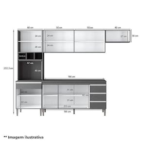 Começou a montar sua cozinha? Então apresentamos para você este conjunto da linha Andréia. Composto por paneleiro duplo com três nichos adega e espaço para acomodar seu micro-ondas ou forno elétrico. O armário aéreo sobre a geladeira com abertura basculante e outro com quatro portas é perfeito para manter seus utensílios sempre à mão. Conta ainda com balcão de cozinha com três portas e três gavetas. Fabricado pela AJL, possui design moderno, acabamento de qualidade em 100% MDP e excelente aproveitamento. Perfeito para quem busca praticidade e organização sem abrir mão do estilo. Aproveite e garanta já o seu!