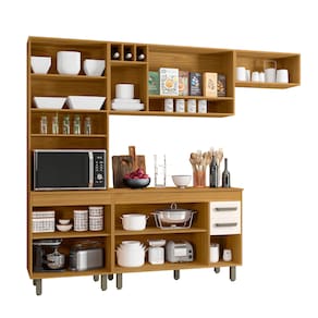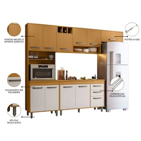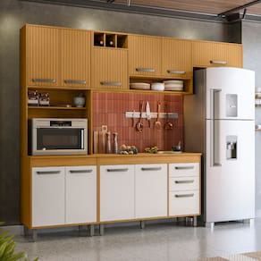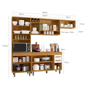 O paneleiro duplo com 218 cm de altura possui 4 portas com dobradiças metálicas de 26mm, prateleiras internas e um nicho ideal para micro-ondas (A: 42 x L: 65 x P: 50 cm), oferecendo praticidade no dia a dia. Já o aéreo de 120 cm conta com 3 portas, nicho decorativo (A: 23,5 x L: 65 x P: 18 cm) e adega para 3 garrafas, unindo charme e utilidade.
