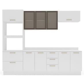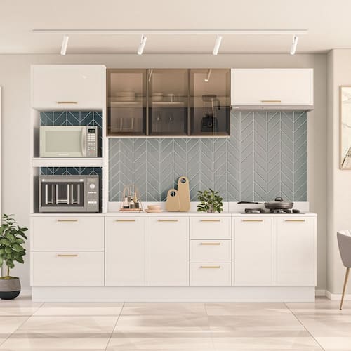 A Cozinha Amara com Rodapé, Torre Quente, Armário Cristaleira, Aéreo Basculante e Balcão com Tampo é a escolha ideal para quem busca um ambiente moderno, funcional e extremamente elegante. Com 224,5 cm de altura, 270 cm de largura e 52 cm de profundidade, ela oferece excelente aproveitamento de espaço, organização inteligente e praticidade no dia a dia. Conta com puxadores de metal que garantem mais resistência e sofisticação, além de acabamento em pintura UV que proporciona maior durabilidade e facilidade de limpeza. Acompanha rodapé decorativo e tampo para pia, entregando um conjunto completo, perfeito para transformar sua cozinha em um espaço bonito, otimizado e cheio de estilo.