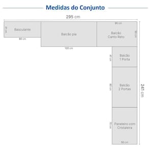 Medida de cada item (A x L x P): Paneleiro Duplo: 213cm x 70cm x Sup.31cm Inf.50cm; Aéreo triplo: 76cm x 120cm x 31cm; Balcão 120cm: 84cm x 120cm x 50cm; Aéreo Geladeira: 34cm x 80cm x 31cm; Aéreo Geladeira: 34cm x 80cm x 31cm; Balcão 80cm: 86cm x 80cm x 50cm; Tampo: 2,7cm x 80cm x 50cm; Balcão 1porta: 86cm x 41cm x 50cm; Balcão canto: 86cm x 95cm x 50cm; Aéreo 1 porta: 76cm x 41cm x 31cm; Aéreo canto: 76cm x 95cm x 31cm.