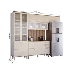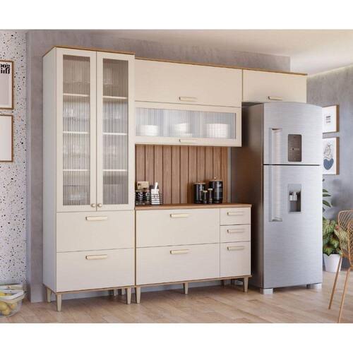 Cozinha Compacta 100%Mdf 5 Peças 2 Aéreos 1 Balcão 1 Paneleiro C/ Ripado 120Cm Bella Mgm Freijó/Off White