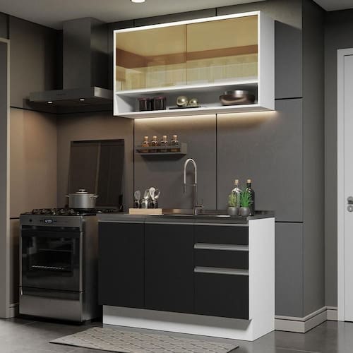 O acabamento da estrutura é branco e as portas e frentes são pretas. É feito em Pintura Poliéster ecológica, com aplicação de 7 camadas de proteção resistentes a álcool, água e calor.