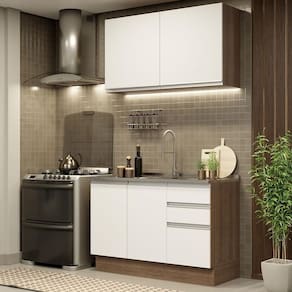 A modulação é composta por um balcão para pia e um armário aéreo. Super espaçosos e com ótimo tamanho, são perfeitos para organizar todos os utensílios e louças da sua cozinha.