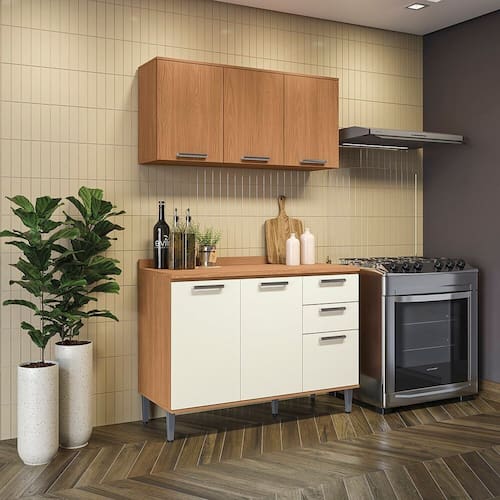Sua cozinha mais completa com o Combo CB1453 da Cozinha Linna Kappesberg. Produzido em MDP de 15mm, são 2,05m de altura, 1,20m de largura e 52cm de profundidade, com estrutura em pintura touch na cor canela, e as frentes, variam entre o canela nos aéreos e off white nos balcões, ambos em acabamento fosco. Com pezinhos em polipropileno na cor champanhe, você também poderá montá-lo suspenso, deixando sua cozinha do seu jeito. Versátil e indispensável, são duas peças que se adaptam a todos os espaços, unindo o balcão e aéreo de pia, com tampo, garantindo praticidade na organização. O destaque fica para as dobradiças com amortecimento, corrediças telescópicas e os puxadores em polipropileno na cor ônix, que completam a beleza e o design do produto.