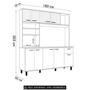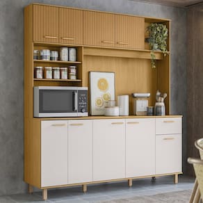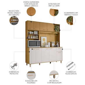 A Cozinha Compacta é composta por nove portas, sendo as quatro na parte superior com detalhe em ripado gráfico, que combina com diversos estilos de decoração. Inclui também uma gaveta com corrediças telescópicas que garantem uma abertura total e fácil acesso aos itens armazenados. Conta ainda com um compartimento para micro-ondas ou forno elétrico e três nichos decorativos para acomodar temperos e exibir seus itens favoritos.