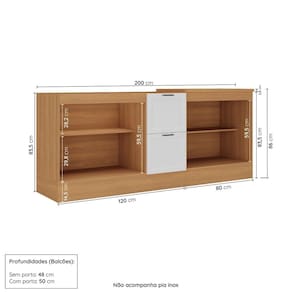 Medida de cada item (A x L x P): Balcão 2 portas 2 gavetas (sem tampo): 83,5cm x 120cm x 50cm; Balcão 2 portas (com tampo): 86cm x 80cm x 50cm.