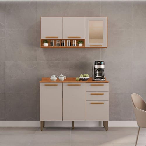 Você nunca imaginou que sua Cozinha pudesse ficar tão organizada. Com este Armário de Cozinha Combo Bella 04 o espaço fica ainda mais convidativo e sempre pronto para preparar pratos incríveis, otimizando o espaço para guardar seus utensílios. Confeccionado com materiais de resistência, qualidade e inovação ele é a melhor opção para completar o ambiente, cores modernas que combinam com tudo que escolher. Acabamento da Prateleira: Pintura Escala de Brilho da Prateleira: Semi-Brilho Acabamento da Gaveta: Pintura UV Escala de Brilho da Gaveta: Semi-Brilho Material do Puxador da Gaveta: MDF Acabamento da Porta: Pintura Escala de Brilho da Porta: Semi-Brilho Material do Puxador da Porta: MDF Acabamento dos Pés: Pintura Acompanha Tampo: Sim Altura dos Pés: 16 Altura Máxima dos Pés: 16.0000 Ambiente Principal: Cozinha codigo_ean: 7909903502723 Complexidade da Montagem: Alta: deve ser montado por um montador especializado Cor: Cinamomo/Off White Cor do Produto: Cinamomo/Off White Escala de Brilho: Semi-Brilho Espessura do Tampo: 15 mm Gaveta com Chave: Não Itens Inclusos: 1 Armário Aéreo, 1 Balcão, Manual de Montagem e Kit Ferragens. Linha ou Coleção: Bella Manual de Montagem e Instalação: https://product-hub-prd.madeiramadeira.com.br/882234/documents/2b99639a-6a2e-4d3b-b385-2ca58731d0bc1686609manualvalencia04.pdf Material da Dobradiça/Corrediça da Porta: Metálica Material da Gaveta: MDP Material da Porta: MDP Material da Prateleira: MDP Material do Fundo: MDF Material do Tampo: MDP Material dos Pés: Polipropileno Medida de cada item (A x L x P): Armário Aéreo Reflecta 54,5cmx120cmx26cm; Balcão 85,5cmx120cmx36,5cm modular: Sim Necessita Montagem: Sim O Balcão Acompanha Pia: Não Origem do Produto: Nacional Pés Reguláveis: Sim Peso: 436 kg Peso Máximo por Gaveta: 5 kg Peso Máximo por Prateleira: 5 kg Possui Pés: 06 Possui Portas: Sim Possui Prateleiras: Sim Possui recorte para Cooktop: Não Possui Rodízio: Não Possui Vidro: Sim Produto Montado: Sim Recomendações de Uso, Manutenção e Limpeza: Limpar com flanela limpa e seca. Não usar produtos abrasivos. Sapatas Niveladoras: Sim Sistema de Montagem: Parafusos e cavilhas Tamanho Indicado da Pia: Não possui. Tipo de Corrediça da Gaveta: Metálica Telescópica Tipo de Dobradiça da Porta: 35 mm Tipo de Puxador da Gaveta: Externo Tipo de Puxador da Porta: Externo