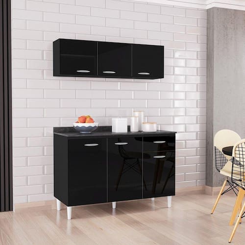 Combo Chic- Aéreo, Balcão, Tampo 1,20m Poquema Móveis, foi desenvolvido para ser prático e moderno, além de dar harmonia na cozinha, também trazem um amplo espaço interno com um preço super acessível, com um ótimo acabamento. Acabamento da Gaveta: Pintura Escala de Brilho da Gaveta: Brilhante Material do Puxador da Gaveta: Plástico Acabamento da Porta: Pintura Escala de Brilho da Porta: Brilhante Material do Puxador da Porta: Plástico Acabamento dos Pés: Polipropileno Acompanha Tampo: Sim Altura dos Pés: 11 cm Ambiente Principal: Cozinha Complexidade da Montagem: Baixa: pode ser montado por uma pessoa sozinha Cor: Preto Cor do Produto: Preto Cor Flex: Não Cor Interna: Amadeirado Escala de Brilho: Brilhante Gaveta com Chave: Não Itens Inclusos: 1 Aéreo 1 Balcão, Kit de Ferragens e Manual de Montagem Linha ou Coleção: Manual de Especificação Técnica: https://cdn2.madeiramadeira.com.br/atributo/moveis-poquema/1097595-a843-aEreo-3p-120cm.pdf Manual de Montagem e Instalação: https://cdn2.madeiramadeira.com.br/atributo/moveis-poquema/1097594-a434-balcAo-3p-1g-p-cuba.pdf Material da Gaveta: MDP Material da Porta: MDP Material do Fundo: MDF Material do Tampo: MDP Material dos Pés: Plástico Medida de cada item (A x L x P): Aéreo: 36x120x26cm /Balcão 82x120x52cm/Tampo 1,5x120x52cm Montagem Flex: Não Necessita Montagem: Sim O Balcão Acompanha Pia: Não Origem do Produto: Nacional Pés Reguláveis: Não Peso: 40 kg Peso Máximo por Gaveta: 1,5 kg Possui Pés: 05 Possui Portas: 06 Possui Prateleiras: Não Possui recorte para Cooktop: Não Possui Rodízio: Não Recomendações de Uso, Manutenção e Limpeza: Pano úmido e seco, não pode ser utilizado produtos abrasivos Sapatas Niveladoras: Não Sistema de Montagem: Parafuso, Cavilha, Dobvradiça, Corrediça Suporta Até (kg): 40 kg Tamanho Indicado do Tampo ou Pia: 1.2 Tipo de Corrediça da Gaveta: Simples Tipo de Dobradiça da Porta: Simples Tipo de Puxador da Gaveta: Externo Tipo de Puxador da Porta: Externo
