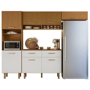 O Armário Aéreo dispõe de duas portas com detalhe em ripado gráfico e dois nichos para temperos e itens decorativos. Para completar, o Armário de Geladeira traz uma porta basculante com pistão a gás, que facilita o manuseio. Com uma prateleira interna, a Cozinha Compacta possui amplo espaço para acomodar utensílios, louças e mantimentos.