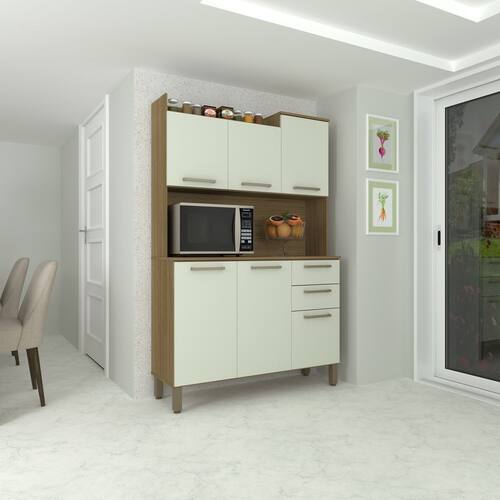 MATÉRIA PRIMA EM MDP 15mm ESTRUTURA E PRATELEIRAS EM CARVALHO UV FRONTAL EM AREIA PF 2 PRATELEIRAS 6 PORTAS Dobradiças metálicas curva Ø35mm com amortecimento Não Possui Pistão a gás 2 GAVETAS Corrediças Telescópicas MONTAGEM COM CAVILHAS E PARAFUSOS 8 Puxadores Em Plastico Gold Itens inclusos: Manual de montagem, ferragens e acessórios Dimensões (AxLxP): 1203 x 1840 x 390mm Garantia de 3meses