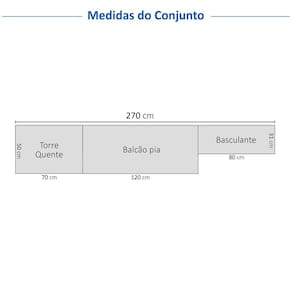 Medida de cada item (A x L x P): Paneleiro Duplo: 213cm x 70cm x sup 31cm/inf 50cm; Aéreo triplo: 76cm x 120cm x 31cm; Aéreo basculante: 34,4cm x 80cm x 31cm; Balcão 2 portas 2 gavetas (sem tampo): 83,5cm x 120cm x 50cm.