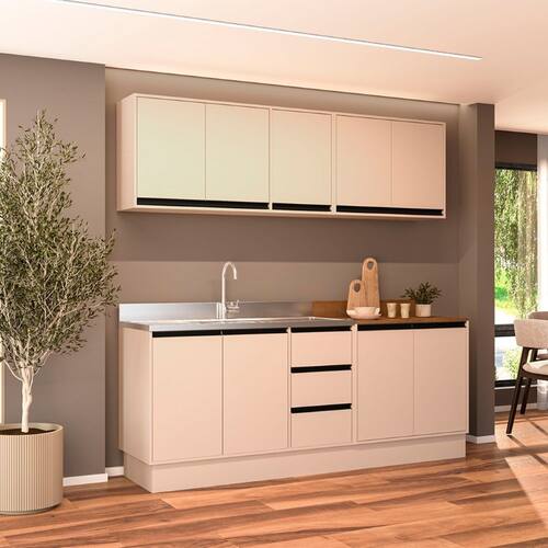 Características: Estrutura MDP Pintura UV 09 Portas com dobradiças metálicas 03 Gavetas com corrediças telescópicas Puxadores de Plástico Possui prateleiras com amplo espaço Possui Rodapé Peso suportado nas Prateleiras Estruturais: 10kg Peso suportado nas Prateleiras: 5kg Peso suportado nas Gavetas: 3kg *Não acompanha Tampo*