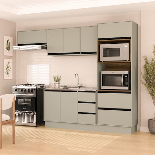 Características: Estrutura MDP Pintura UV 05 Portas com dobradiças metálicas 03 Portas com pistão à gás 04 Gavetas com corrediças telescópicas 02 Nichos para eletroportáteis Puxadores de Plástico Peso suportado nas Prateleiras Estruturais: 10kg Peso suportado nas Prateleiras: 5kg Peso suportado nas Gavetas: 3kg *Não acompanha Tampo*