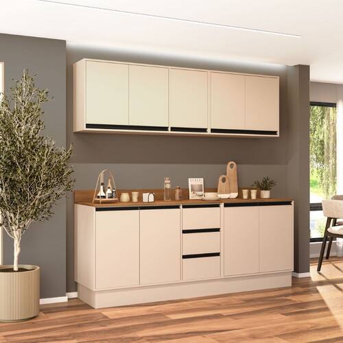 Características: Estrutura MDP Pintura UV 09 Portas com dobradiças metálicas 03 Gavetas com corrediças telescópicas Puxadores de Plástico Possui prateleiras com amplo espaço Possui Rodapé Peso suportado nas Prateleiras Estruturais: 10kg Peso suportado nas Prateleiras: 5kg Peso suportado nas Gavetas: 3kg *Acompanha Tampo*