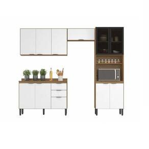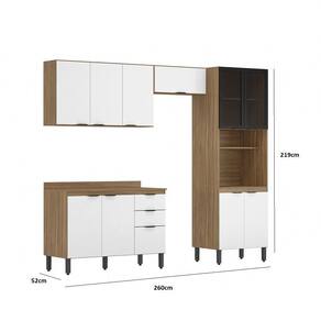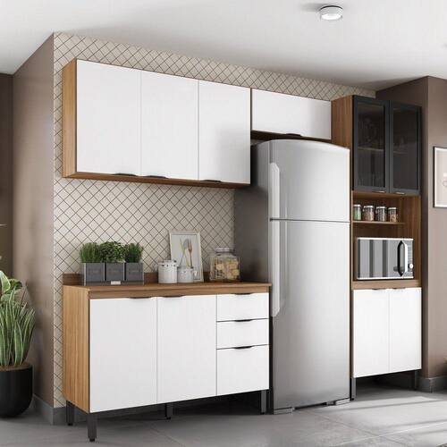 Compõe a cozinha: 1 Aéreo de geladeira 70cm porta basculante com pistão a gás, 1 Aéreo 3 portas 120cm com prateleiras internas, 1 Paneleiro 4 portas com 2 portas de vidro fume, 1 Balcão 120cm com 3 portas e 2 gavetas com tampo que pode ser substituído por pia.