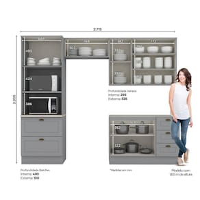 Medida de cada item (A x L x P): Torre Quente 220,5x71,5x51 cm | Aéreo 1 Porta Basculante 34x80x32,5 cm | Aéreo 3 Portas 83x120x32,5 cm | Balcão Pia 3 Gavetas 82x120x51 cm.
