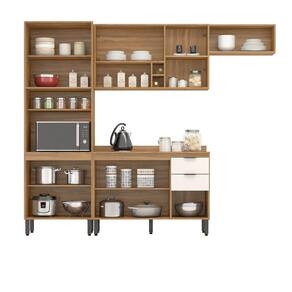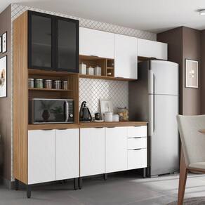 A cozinha modular FIRENZE FL0006 é formada por um paneleiro 4 portas com 2 portas de vidro fume ambos com espaço para forno de até 44L, um aéreo de geladeira 70cm porta basculante com pistão a gás, um armário aéreo 2 portas e nicho, um balcão 120cm com 3 portas e 2 gavetas com tampo que pode ser substituído por pia. Seus pés são de polipropileno reguláveis se adequando as condições do chão, puxadores pretos com design moderno, corrediças e dobradiças metálicas. Estruturado em MDP com revestimento ultravioleta e acabamento fosco.