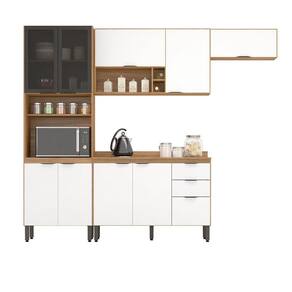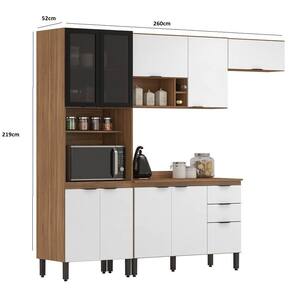 Cozinha compõe: 1 Paneleiro 4 portas sendo com 2 portas de vidro fume ambos com espaço para forno de até 44L 1 Aéreo de geladeira 70cm porta basculante com pistão a gás, 1 Aéreo 2 portas e nicho 1 Balcão 120cm com 3 portas e 2 gavetas com tampo que pode ser substituído por pia.