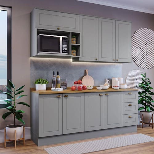 Itens Inclusos: 1 Aéreo 3 Portas, Balcão Pia 3 Gavetas 2 Portas com Tampo, 1 Aéreo 1 Porta Basculante, Balcão 2 Portas com Tampo, 1 Aéreo Microondas, Kit Ferragens e Manual de Montagem