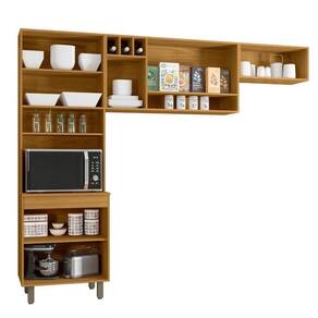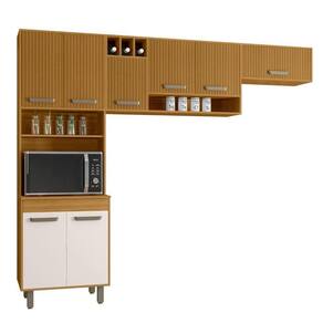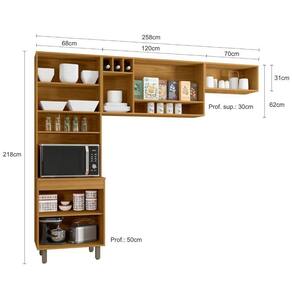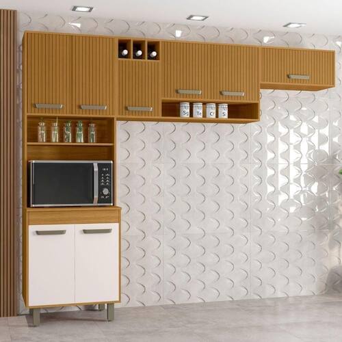 Com 218 cm de altura, o paneleiro duplo possui 4 portas com dobradiças reforçadas de 26 mm, prateleiras internas e um nicho funcional para micro-ondas (42 x 65 x 50 cm). O aéreo de 120 cm conta com 3 portas, nicho decorativo (23,5 x 65 x 18 cm) e adega para 3 garrafas. Já o aéreo geladeira traz porta basculante com pistão a gás, que permite abertura suave e pode ser sobre a geladeira ou fogão.
